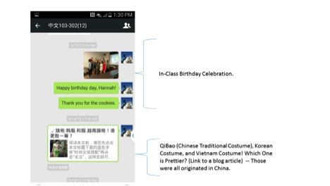 As a user of WeChat, I receive tons of information from friends’ posts and public subscriptions, and I often forward the ones that are relevant to Chinese culture and language learning to the class via the app.